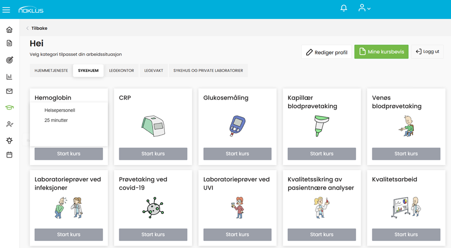 Tema er blant annet blodprøvetaking, laboratorieprøver ved UVI, pasientnære analyser, laboratorieprøver ved infeksjoner og kvalitetsarbeid. Kursene er tilpasset våre ulike deltakere. Se utklipp fra "Min side" under.