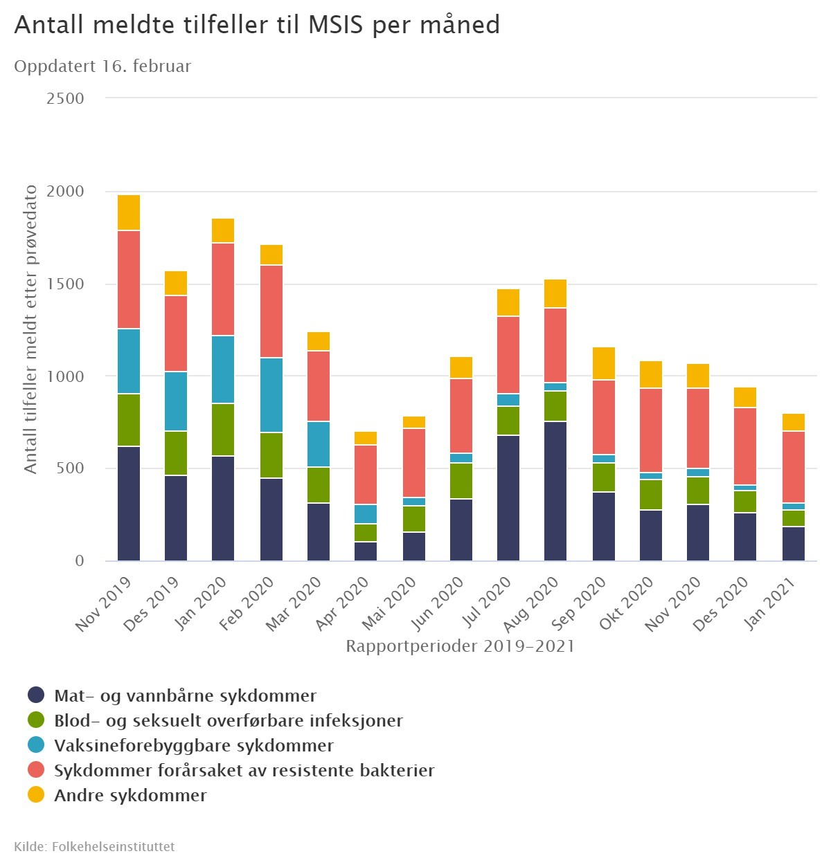 Mange av oss går med inntrykk at det generelt er færre tilfeller av smittsomme sykdommer i befolkningen nå enn i et normalår. Tallenes tale bekrefter dette. I januar 2021 ble det meldt om 803 tilfeller av smittsomme sykdommer til Meldesystemet for infeksjonssykdommer (MSIS), mot 1 859 i januar 2020 (figur 1). Etter nedstengningen 12. mars i fjor, sank antall tilfeller meldte smittsomme sykdommer med flere hundre tilfeller i forhold til månedene før. Det tilsvarer en nedgang på 60 % fra 2019-tall. I vinter har det nesten ikke forekommet influensa, verken i Norge eller ellers i Europa. Gjennom sommeren i fjor steg antall rapporterte tilfeller igjen, før det fra september igjen kom til en nedgang. Den jevne nedgangen antar man skyldes strengere smitteverntiltak, flere nedstengte virksomheter og redusert reisevirksomhet, men kan også til en viss grad skyldes nedgang i bruk av helsetjenester, hovedsakelig i primærhelsetjenesten.