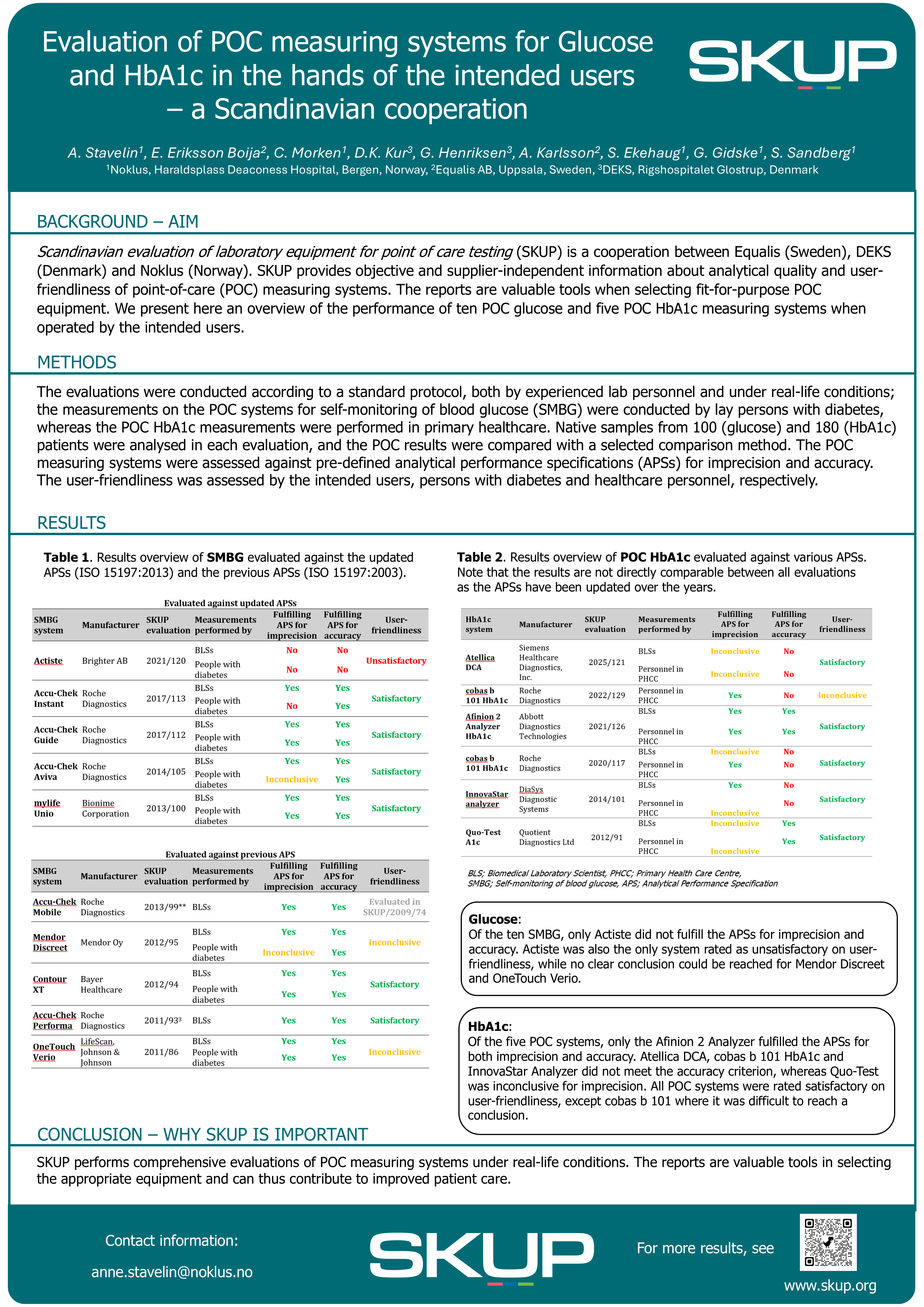 Anne Stavelin, Sverre Sandberg og Gro Gidske er medforfattere på posteren «Evaluation of POC measuring systems for Glucose and HbA1c in the hands of the intended users – a Scandinavian cooperation”. Posteren gir en oppsummering av analysekvalitet og brukervennlighet av pasientnære analyseinstrumenter; ti glukose- og fem HbA1c-instrument.